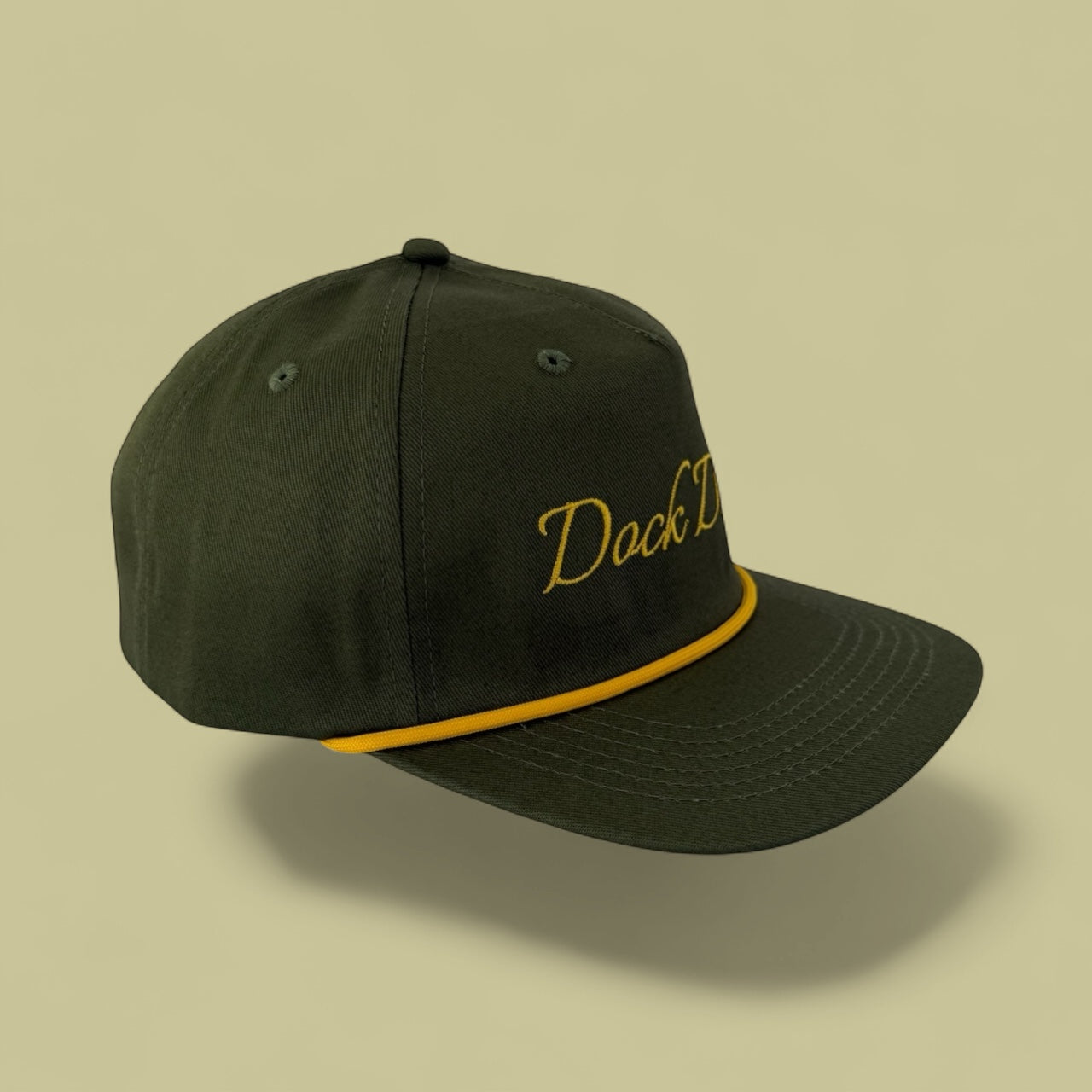 The Dock Dad Cap is equal parts playful and premium. A classic nod to heritage dad hats, reimagined with Dock Gentlemen’s elevated casual touch. Crafted in durable cotton twill with a structured six-panel fit, it’s finished in an olive body with golden embroidery and rope detail that make it stand out dockside or downtown.