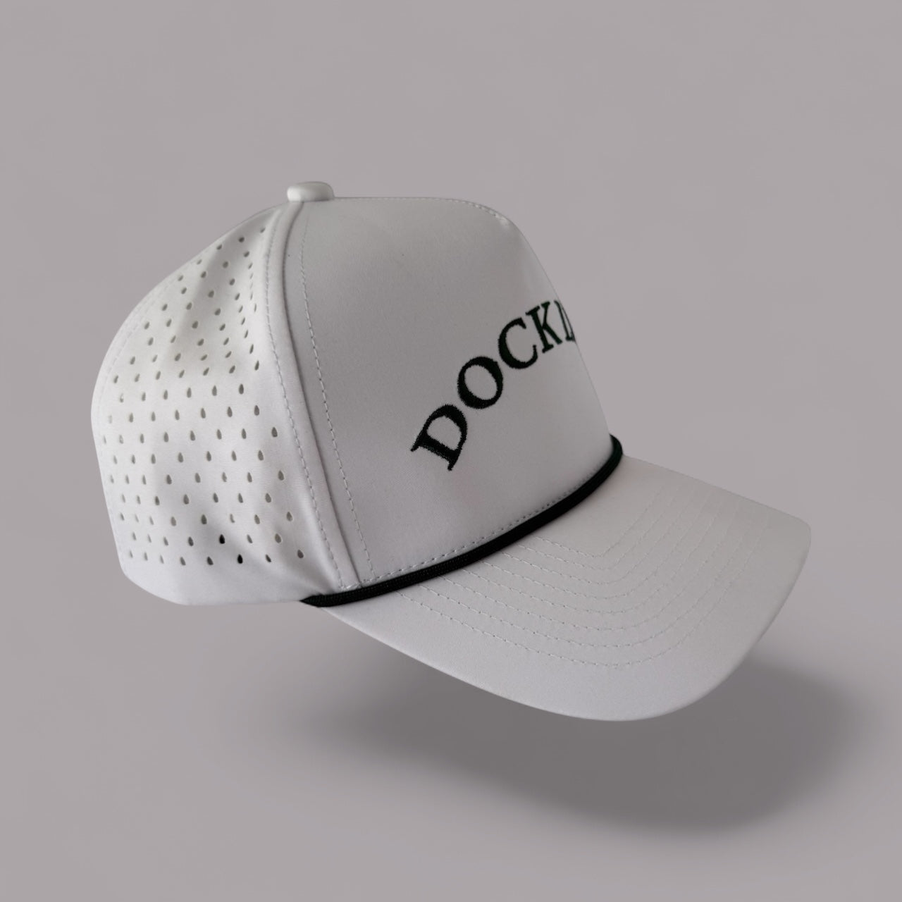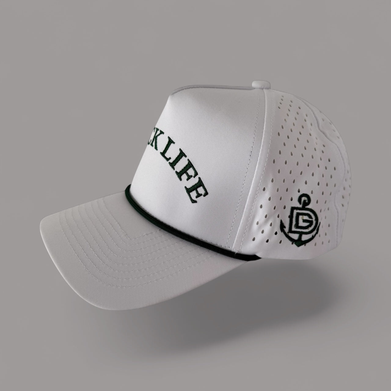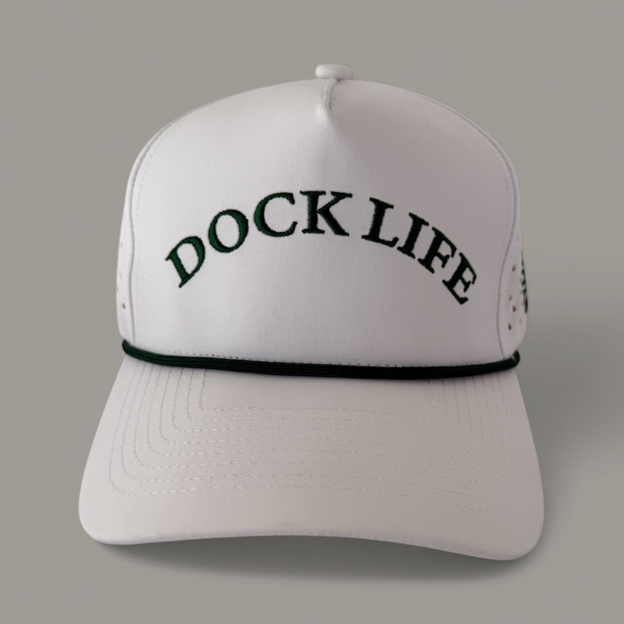 The look is clean but confident: “Dock Life” arched across the front, balanced by the Dock Gentlemen anchor logo at the side. A contrast green rope detail along the brim nods to coastal heritage while perforated side panels keep airflow high.