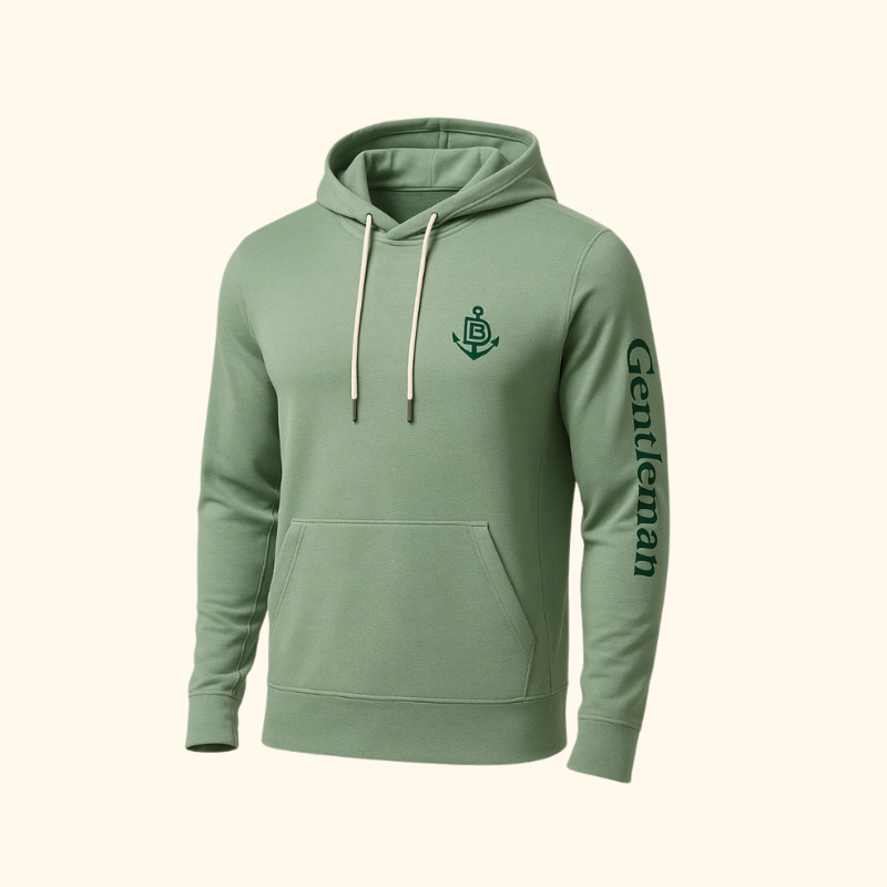 The Sage Green Anchor Hoodie delivers the same Dock Gentlemen identity in a lighter 200–220 GSM cotton-blend fleece. It’s the versatile layer you’ll reach for when the air is crisp but not cold — soft, breathable, and easy to wear anywhere.